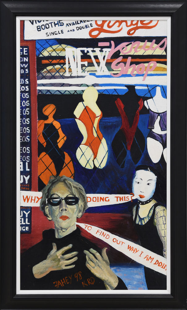 Inscribed ‘Fahey 98 K RD’, this painting is part of her K Rd series in which she painted various scenes of the iconic Karangahape Road during the time she had an artist studio there. As a cultural cornerstone of Auckland City, K Rd has a reputation for its eclecticism. It was, and still is, a hotspot for creatives. The figure depicted to the right is dressed in a mesh long-sleeve top with a black dress, black studded collar and her face painted in geisha-like make up. The figure is asking ‘Why [are you] doing this?’ and the woman in sunglasses (the artist herself) replies, ‘To find out why I am doing [this]’. Fahey has explained that the act of painting is a quest for answers for her. In doing the paintings, she seeks to understand why she is doing them herself.