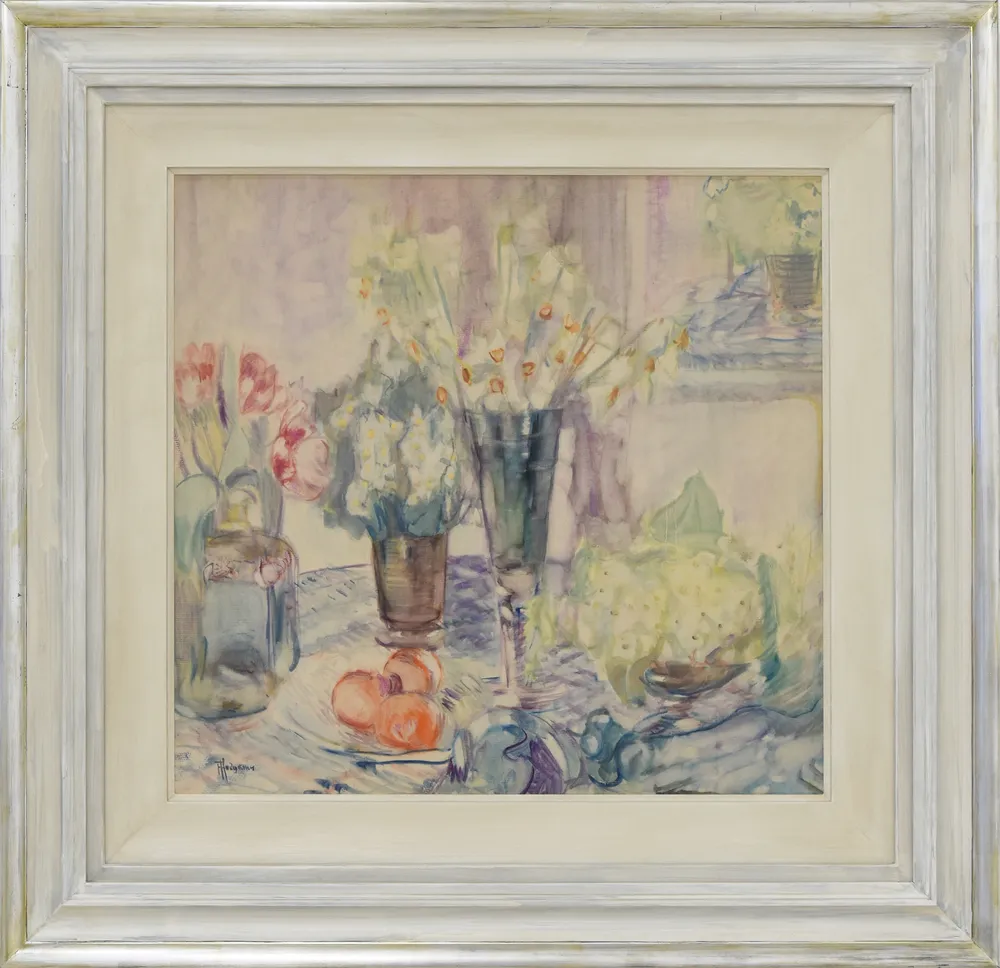 Spring has been attributed to the year 1929, however, recent research suggests there are several stylistic similarities to the work Rosamund from c.1909 - possibly featuring the same table and vase. The signature, similarly, matches others from this period. Thus, this still life of Spring could be from c.1910. In this instance, the work may have been from a grouping of watercolours that Hodgkins hoped to send off to Paris in 1910. Hodgkins wrote in her letters, “the fear of death was upon me in case I couldn’t get them finished, having ordered frames etc…& now they are off to frame – (& fame) I hope.”1 Hodgkins had displayed a mastery of watercolours by this period, which was the catalyst for the beginning of her teaching career—in 1909 she won the American Club prize, which offered an opportunity to have a studio to teach from. Not long after, she was asked to teach watercolour at Colarossi’s, the first woman ever to do so. After a year there, she opened her own teaching studio for only women. Teaching became pertinent to Hodgkins’ survival as an independent female artist. She always placed it as secondary to her own artistic career, however she has been known to have left a real legacy to her students.2