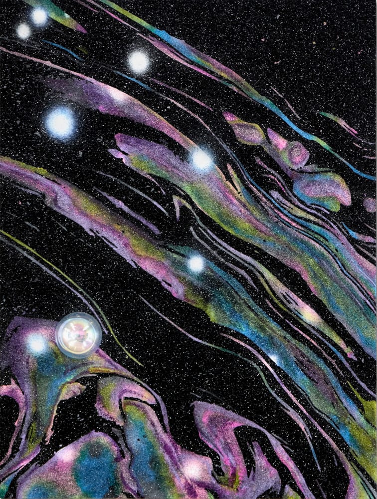 glitter, acrylic and iridescent finish on glass and mixed media on board