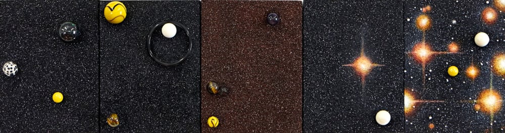 glitter, acrylic, Japanese fresh water pearls, glass, blue goldstone, tiger eye jasper, obsidian and mixed media on board